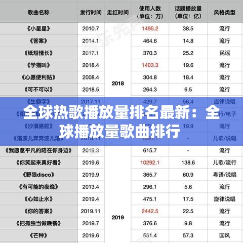 随着音乐产业的不断发展,全球范围内的音乐播放量排名一直是广大乐迷和音乐产业从业者关注的焦点。近日,又一波全球热歌播放量排名新鲜出炉,让我们一起来看看这份榜单都有哪些耳熟能详的名字吧!